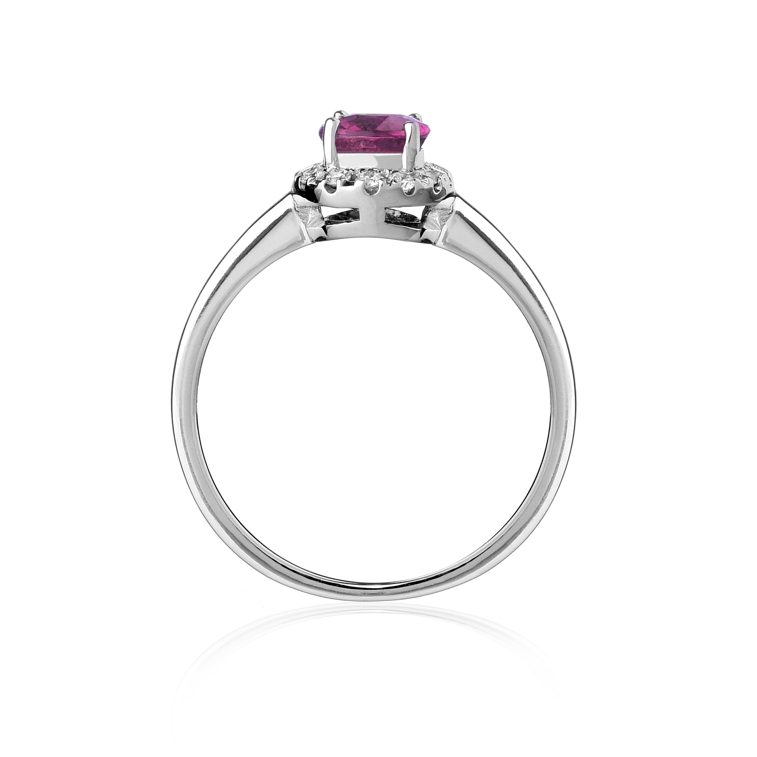 Raffinato ed elegante, questo anello in oro bianco esprime un perfetto equilibrio tra colore, luce e preziosità. Al centro spicca una tormalina rosa naturale da 0,85 ct, selezionata per la sua tonalità delicata e luminosa, simbolo di femminilità e armonia.
