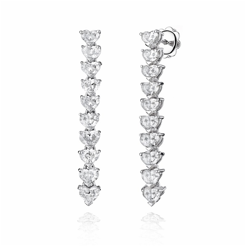 Raffinati ed estremamente luminosi, questi orecchini pendenti in oro bianco sono impreziositi da diamanti naturali a forma di cuore, per un peso complessivo di 2,6 carati.
